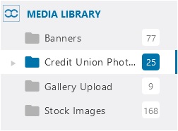 (Notice that you have two tabs at the top UPLOAD FILE and MEDIA LIBRARY. To select files already uploaded make sure you are on the Media tab.) - Go down to Stock Images or the Credit Union Photos category to select the image that you want to use.